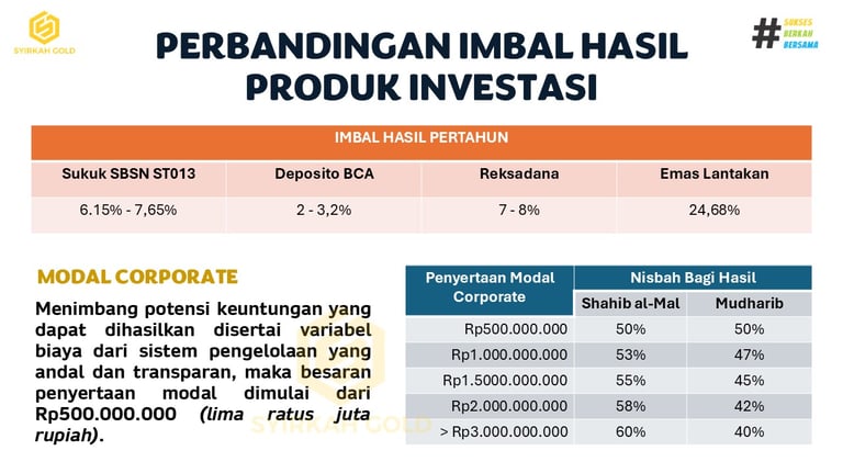 Dibandingkan dengan instrumen konvensional lainnya, program SYIRKAH GOLD menawarkan imbal hasil yang sangat kompetitif: berpotensi 5–6 kali lipat lebih tinggi dari deposito, dan 2–3 kali lipat lebih produktif dibandingkan hanya menyimpan logam mulia secara pasif. Dengan skema bagi hasil yang adil dan transparan, mitra korporat bisa meraih keuntungan berkelanjutan sambil tetap menjaga prinsip kehati-hatian dan tata kelola yang baik. Ditambah lagi, model bisnis ini sepenuhnya bebas dari riba, gharar, dan spekulasi, sehingga cocok bagi institusi yang ingin menerapkan sharia-compliant investment strategy.