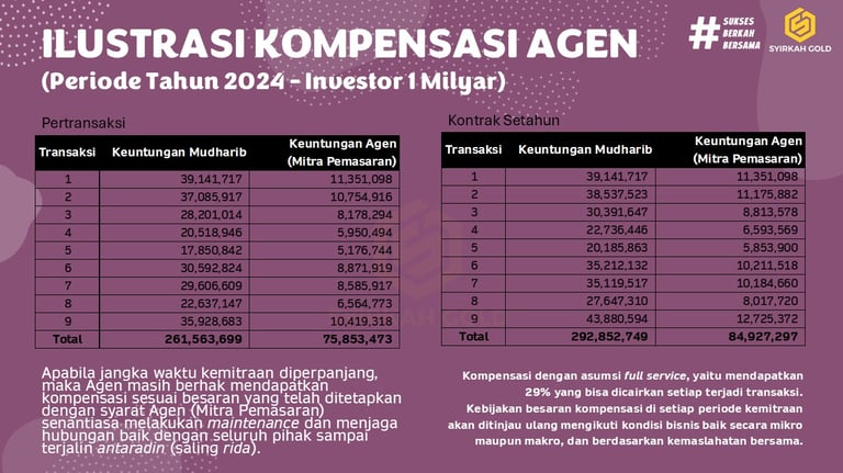 Lebih dari itu, menjadi bagian dari jaringan SYIRKAH GOLD memberi Anda akses pada komunitas produktif dan penuh inspirasi, tempat Anda bisa bertumbuh secara profesional, spiritual, dan sosial. Agency tidak hanya menjadi ujung tombak pertumbuhan usaha, tapi juga duta kebaikan dalam menyebarkan semangat ekonomi syariah yang jujur, amanah, dan memberdayakan. Ini adalah jalan karier dan kontribusi yang tidak hanya menjanjikan secara finansial, tetapi juga membawa nilai-nilai hidup yang lebih dalam dan penuh keberkahan.