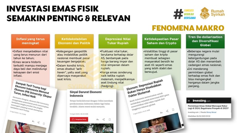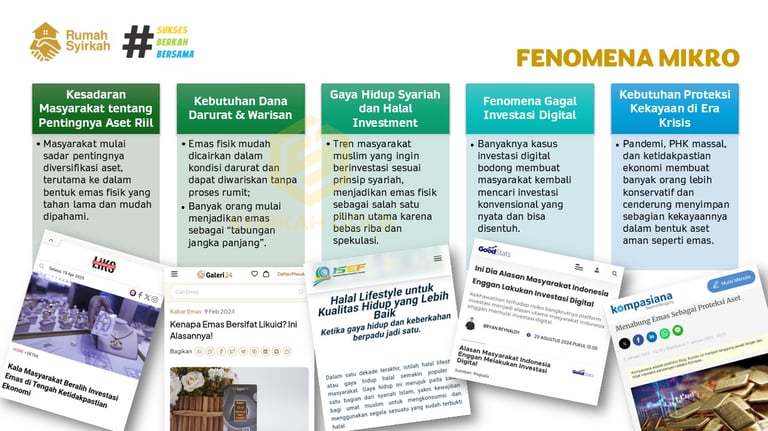 Di tingkat mikro, kesadaran masyarakat terhadap pentingnya kepemilikan aset riil dan perlunya dana darurat semakin meningkat, terutama setelah maraknya kasus gagal investasi di sektor digital dan non-riil. Gaya hidup syariah yang semakin diterima, keinginan untuk berinvestasi secara halal, serta kebutuhan akan proteksi kekayaan di tengah ketidakpastian zaman menjadi pemicu utama perlunya alternatif investasi yang tidak hanya menguntungkan, tetapi juga sesuai dengan prinsip-prinsip Islam. Di sinilah Syirkah Gold hadir sebagai jawaban dari berbagai keresahan dan aspirasi tersebut.