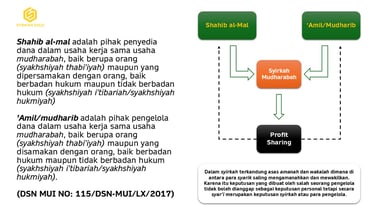 ”Akad mudharabah adalah akad kerja sama suatu usaha antara pemilik modal (malik/shahib al-mal) yang menyediakan seluruh modal dengan pengelola ('amil/mudharib) dan keuntungan usaha dibagi di antara mereka sesuai nisbah yang disepakati dalam akad.”