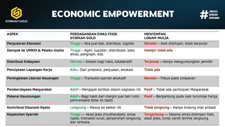 Di SYIRKAH GOLD, kami percaya bahwa setiap orang berhak untuk berdaya secara finansial dan spiritual. Program ini dirancang untuk memberikan akses kepada siapa saja — bukan hanya investor besar — agar dapat terlibat dalam perdagangan emas fisik berbasis syariah. Kami tidak hanya menawarkan peluang keuntungan, tetapi juga ruang belajar, pendampingan, dan komunitas yang saling menguatkan. Di sini, Anda tidak berjalan sendiri. Kami tumbuh bersama dalam semangat empowerment dan kolaborasi.
